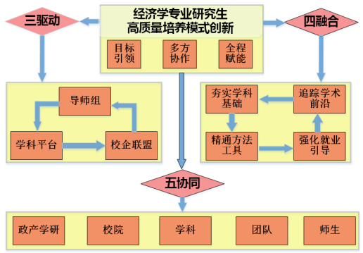 为持续提高人才培养质量,造就适应时代要求的高层次人才,437bwin必赢国际官网在经济学专业研究生培养方面开展了全方位改革,并取得了明显成效。本成果以高水平综合性研究型大学建设为依托,以高层次人才培养为目标,聚焦经济学专业研究生专业基础能力、学术研究能力、实践应用能力的系统化提升,依托437bwin必赢国际官网“应用经济学”一级学科博士点和“理论经济学”一级学科硕士点多年人才培养经验、学术成果积累与人才梯队建设,聚焦经济学专业“四轻”痛点——“轻知识积累的问题意识导向、轻研究能力的创新激发导向、轻知识结构的前沿追踪导向、轻实习实践的就业指引导向”,构建了“目标引领——多方协作——全程赋能”的开环人才培养体系,创新提出了“三驱动、四融合、五协同”人才培养思路,并从“课程体系优化、学术能力训练、科研平台赋能、研究团队支撑、政产学研联动”等方面,扎实推进经济学专业研究生培养体系的优化。本成果已取得良好的人才培养成效,在实践中初步实现了“厚基础知识学习、强前沿学术研究、重政产学研融合、塑综合竞争力培育”的经济学专业研究生高质量培养模式创新。成果主要体系如图1所示。